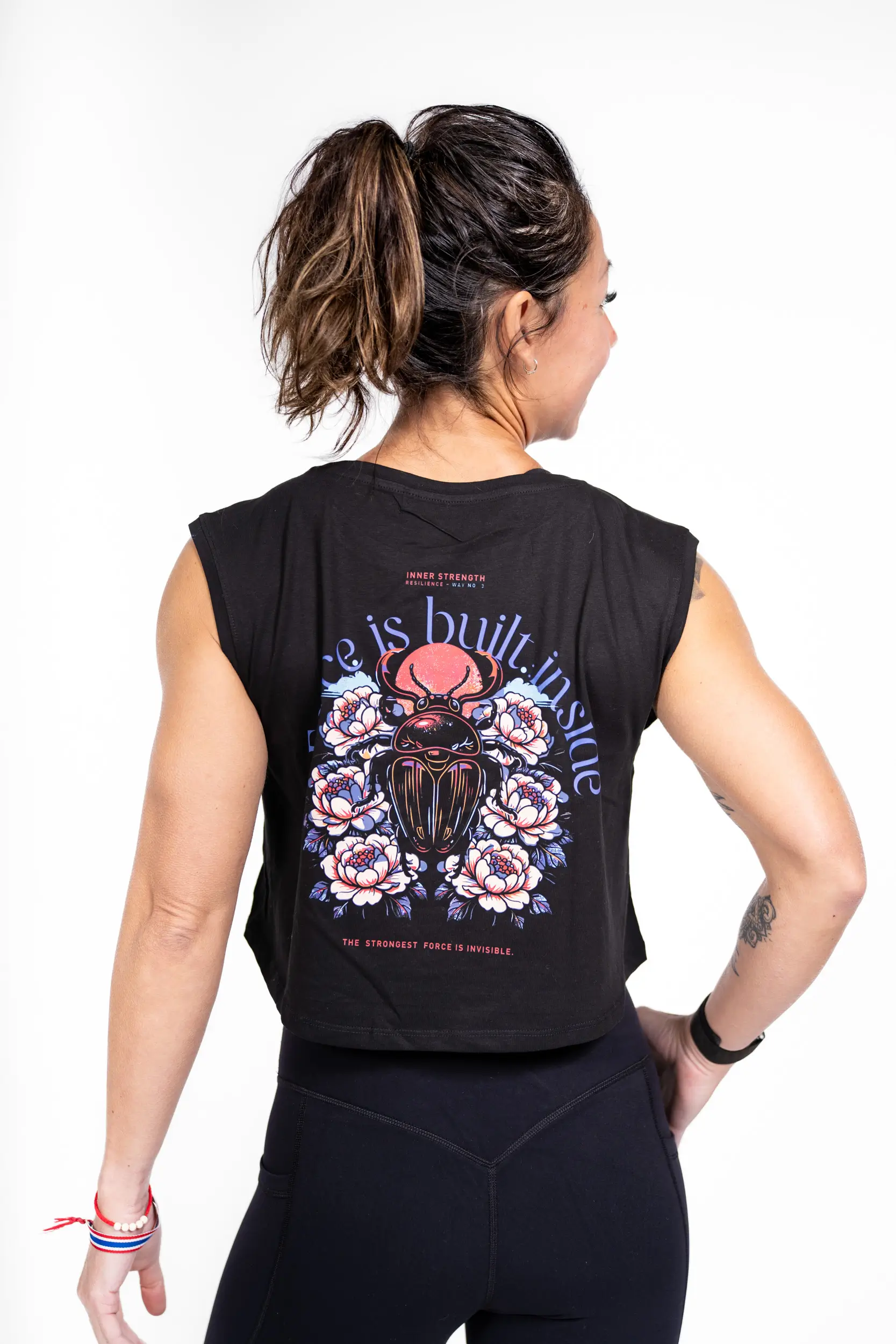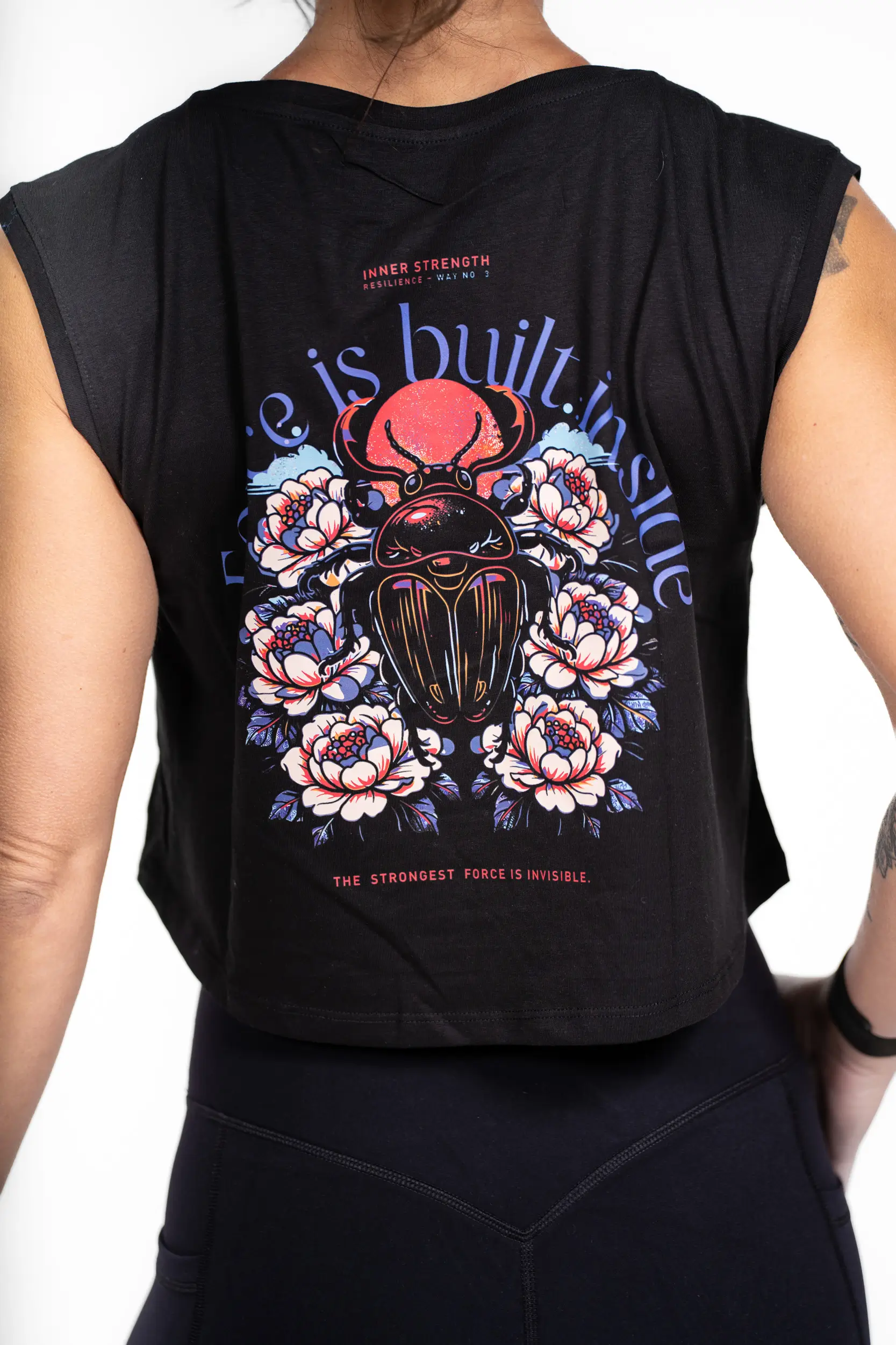 Dieses Design, das aus dem „Inner Force“-Pfad hervorgegangen ist, stellt den Käfer in den Mittelpunkt – ein kraftvolles Symbol für Verwandlung, Widerstandsfähigkeit und unsichtbare Stärke. Umgeben von floralen Elementen und getragen von der Botschaft „Force is built inside“ erinnert es daran, dass wahre Kraft nicht immer sichtbar ist, sondern jeden Tag durch Anstrengung und Disziplin aufgebaut wird. Ein ausdrucksstarkes Motiv, geschaffen für diejenigen, die wissen, dass ihre größte Kraft aus ihrem Inneren kommt.