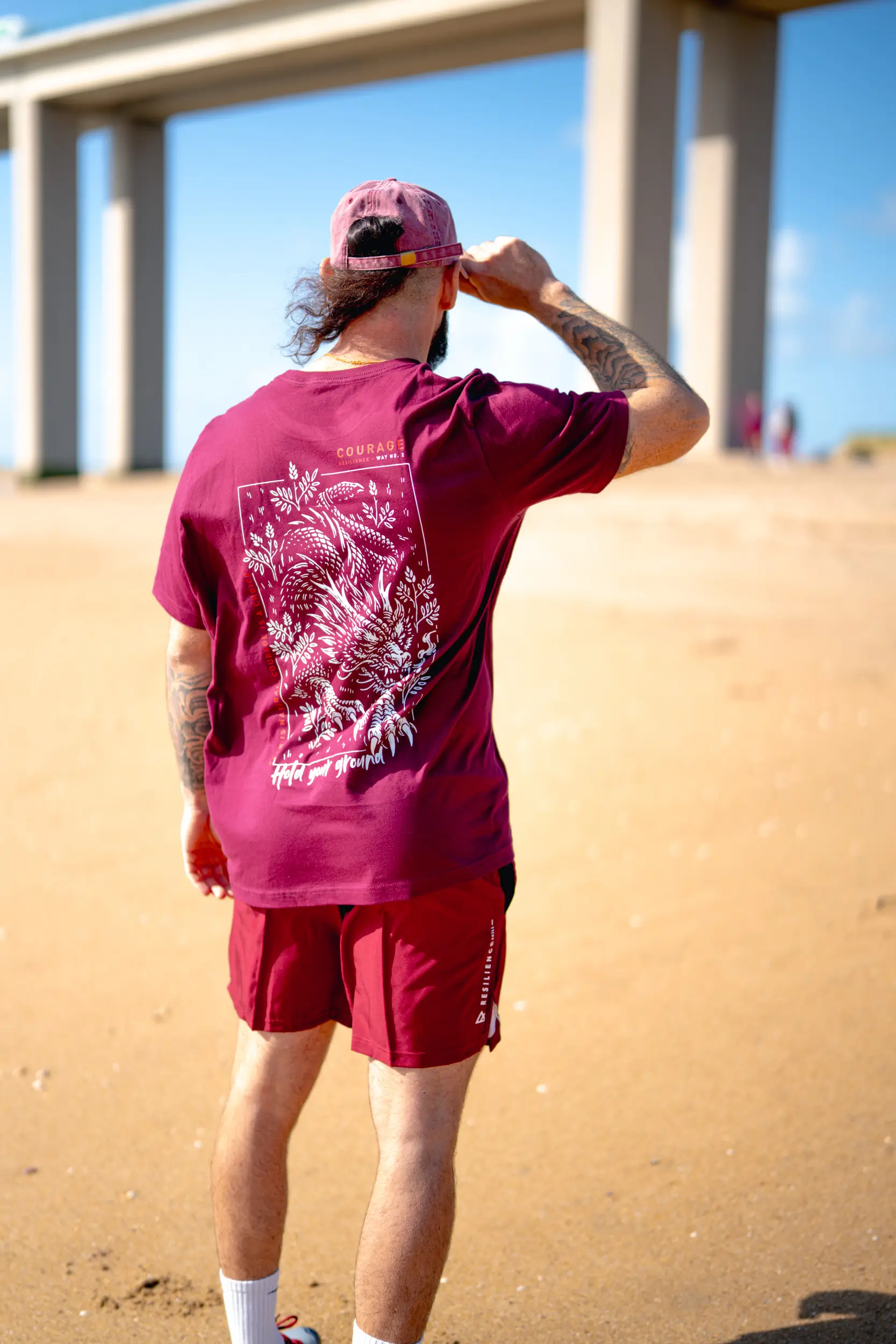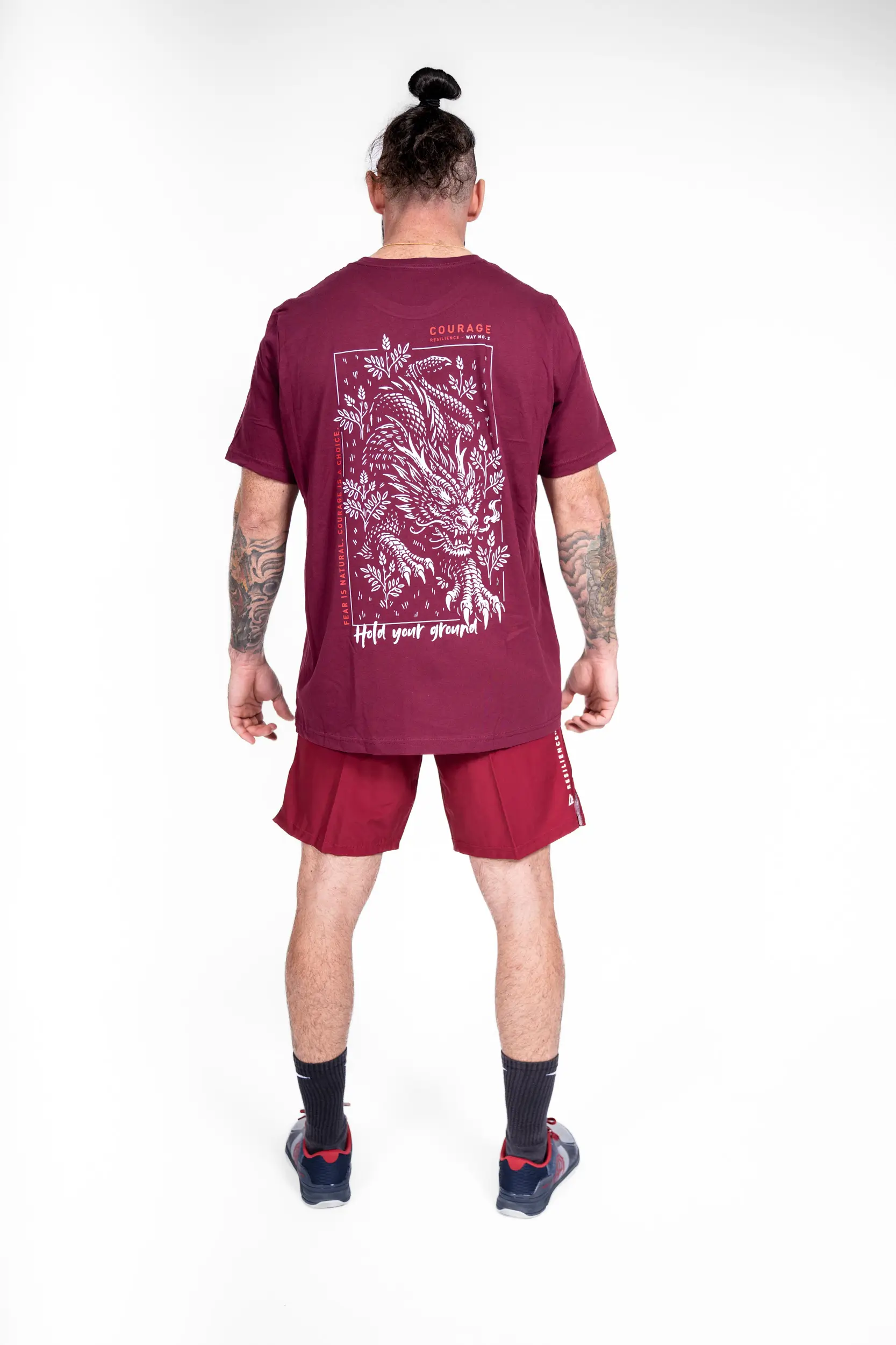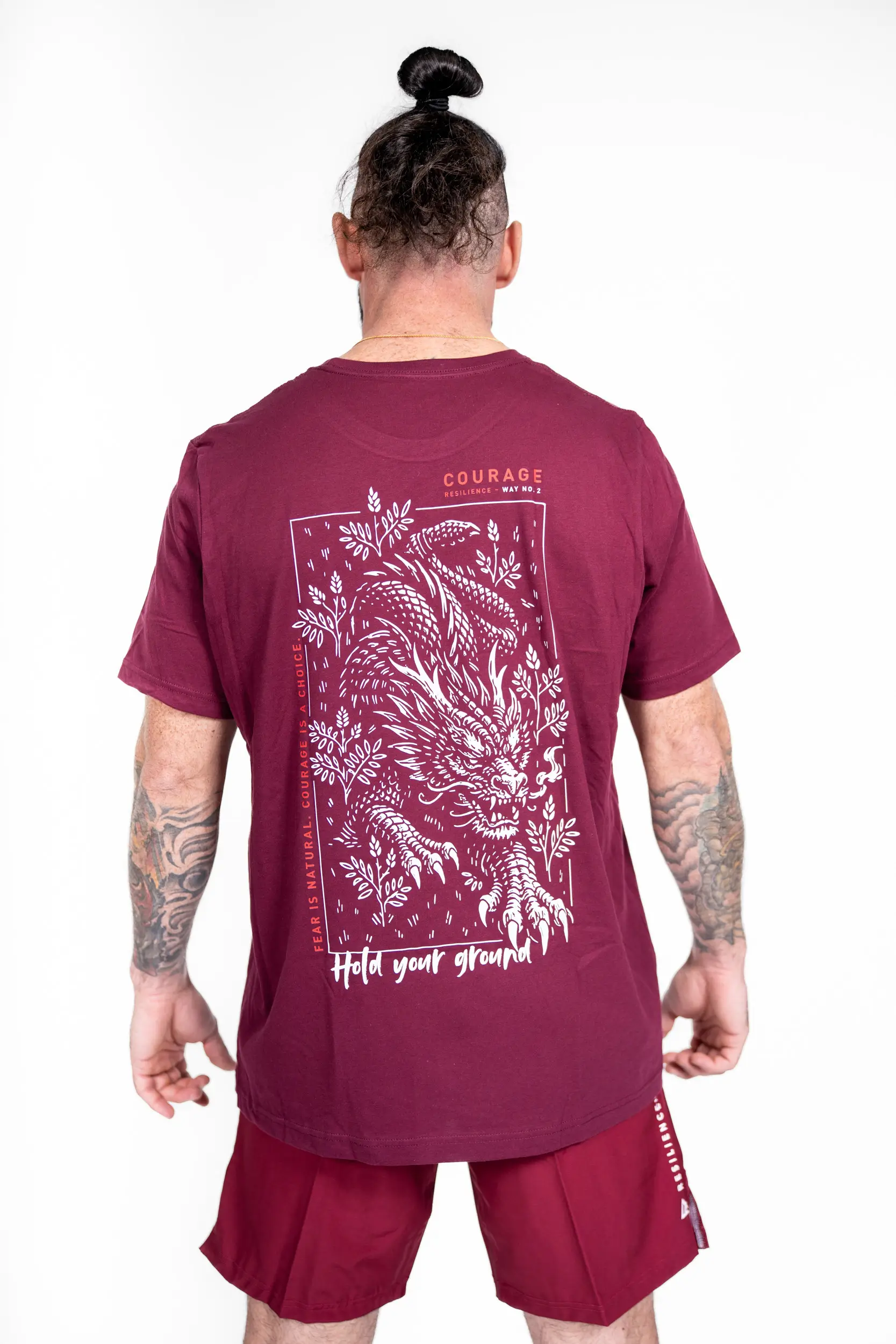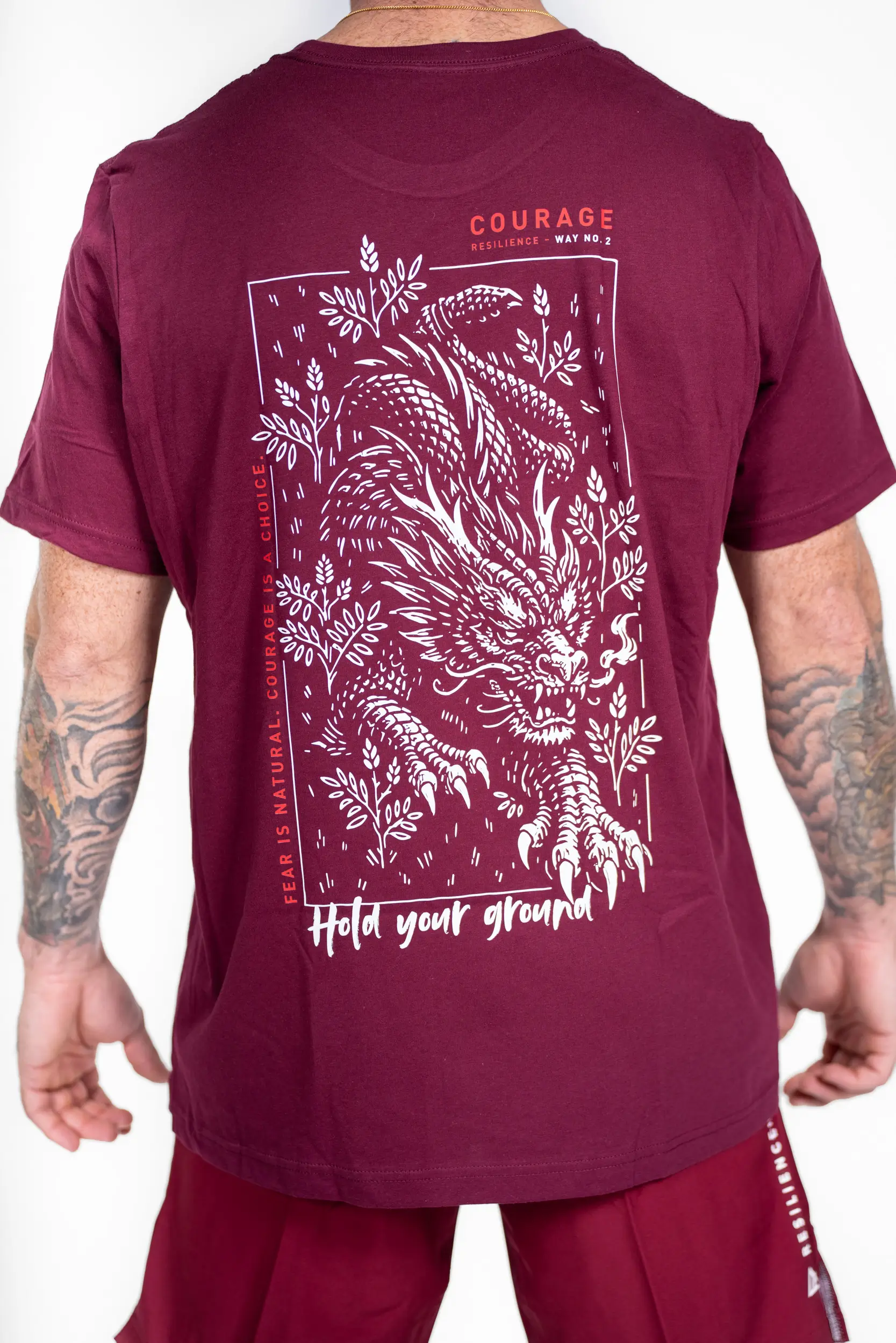 Das Design „Dragon Resolve“ stammt aus dem „Courage“-Weg und verkörpert die innere Stärke im Angesicht der Angst. Der Drache, Symbol für Kraft und Beherrschung, steht für die Fähigkeit, geerdet zu bleiben, sich dem Unbekannten zu stellen und trotz aller Zweifel voranzuschreiten. Die Botschaft „Hold your ground“ unterstreicht diese Idee: nicht zurückweichen, standhaft bleiben, sich der Situation stellen. Ein starkes Bild, gedacht für diejenigen, die wissen, dass Mut nicht die Abwesenheit von Angst ist, sondern die Entscheidung, trotzdem voranzugehen.